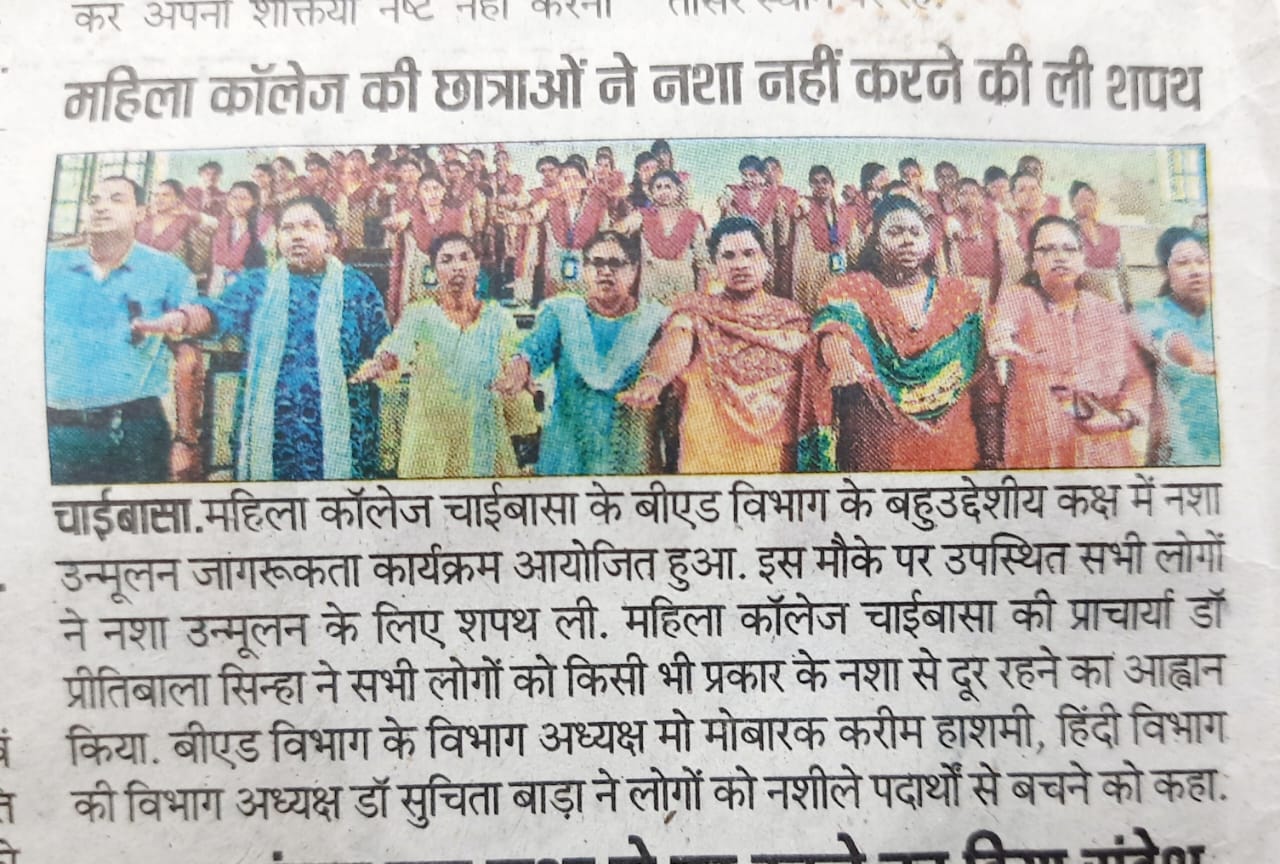 आज दिनांक 25.06.24 को महिला कॉलेज चाईबासा में नशा उन्मूलन हेतु जागरूकता कार्यक्रम का आयोजन