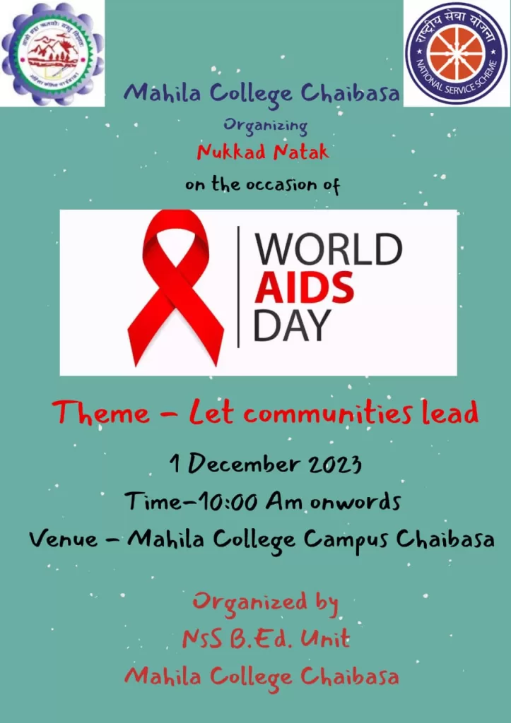 рдЖрдЬ рджрд┐рдирд╛рдВрдХ 01.12.2023 рдХреЛ рдорд╣рд┐рд▓рд╛ рдХреЙрд▓реЗрдЬ рдЪрд╛рдИрдмрд╛рд╕рд╛, рдПрди рдПрд╕ рдПрд╕ рдмреА рдПрдб рдпреВрдирд┐рдЯ рдХреА рдУрд░ рд╕реЗ рд╡рд╛рд▓рдВрдЯрд┐рдпрд░реНрд╕ рдХреЗ рджреНрд╡рд╛рд░рд╛ рд╡рд░реНрд▓реНрдб рдПрдбреНрд╕ рдбреЗ рдХреЗ рдЕрд╡рд╕рд░ рдкрд░ рдиреБрдХреНрдХрдбрд╝ рдирд╛рдЯрдХ рдХрд┐рдпрд╛ рдЧрдпрд╛ред рдиреБрдХреНрдХрдбрд╝